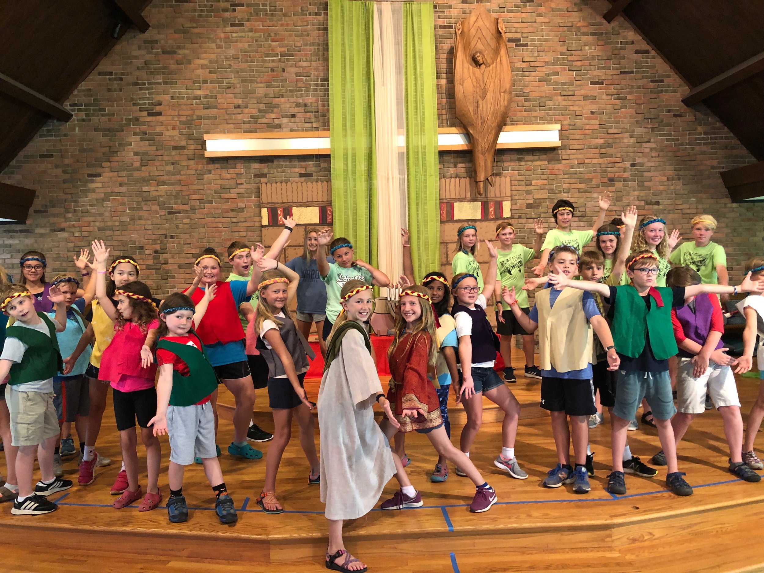 What makes our week unique is that we do it all through a musical. Throughout the week the children learn the music and words to a musical that tells a Biblical story. Middle and high school students act as counselors, shepherding the kids through the process, playing outdoor games with them, singing with them and leading by example. Sets and costumes are created by volunteers and a host of people come and play in the Resurrection pit orchestra for the Thursday night performance.